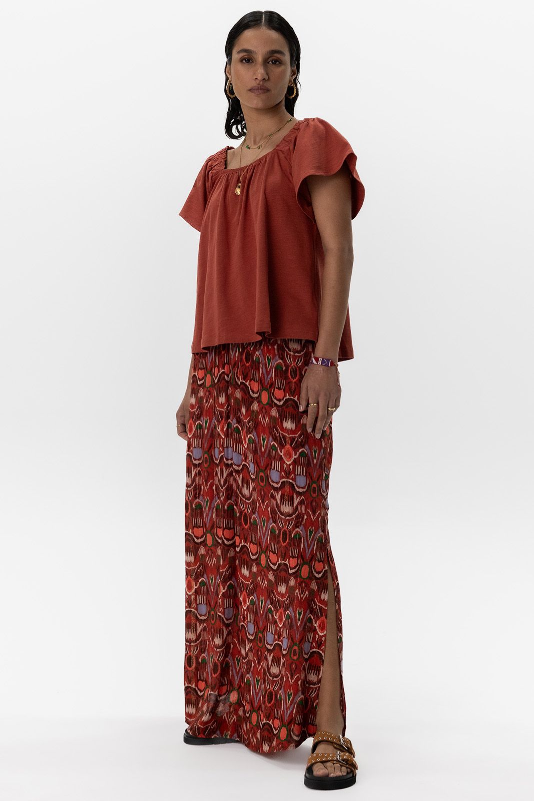 Donkerrode maxi rok met ikat print en splitten