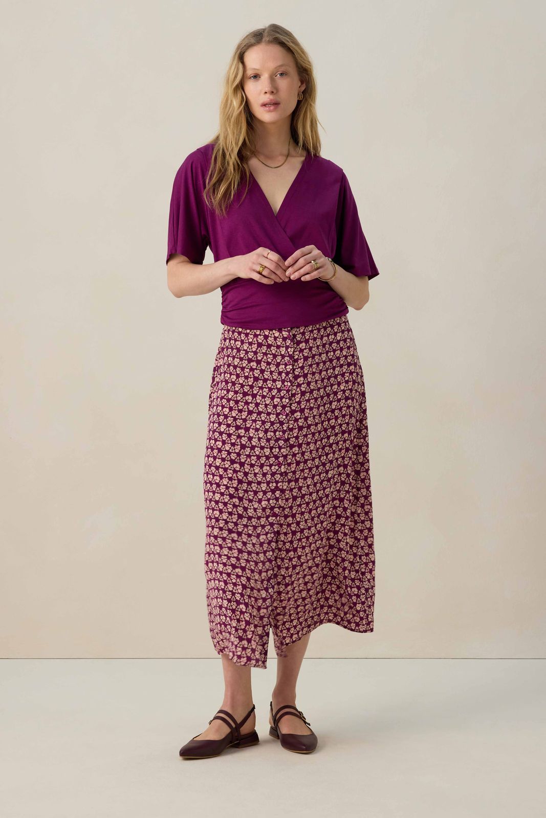 Donkerpaarse midi rok met print