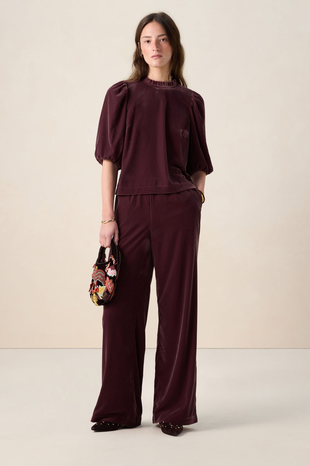 Donkerrode velvet wide leg broek