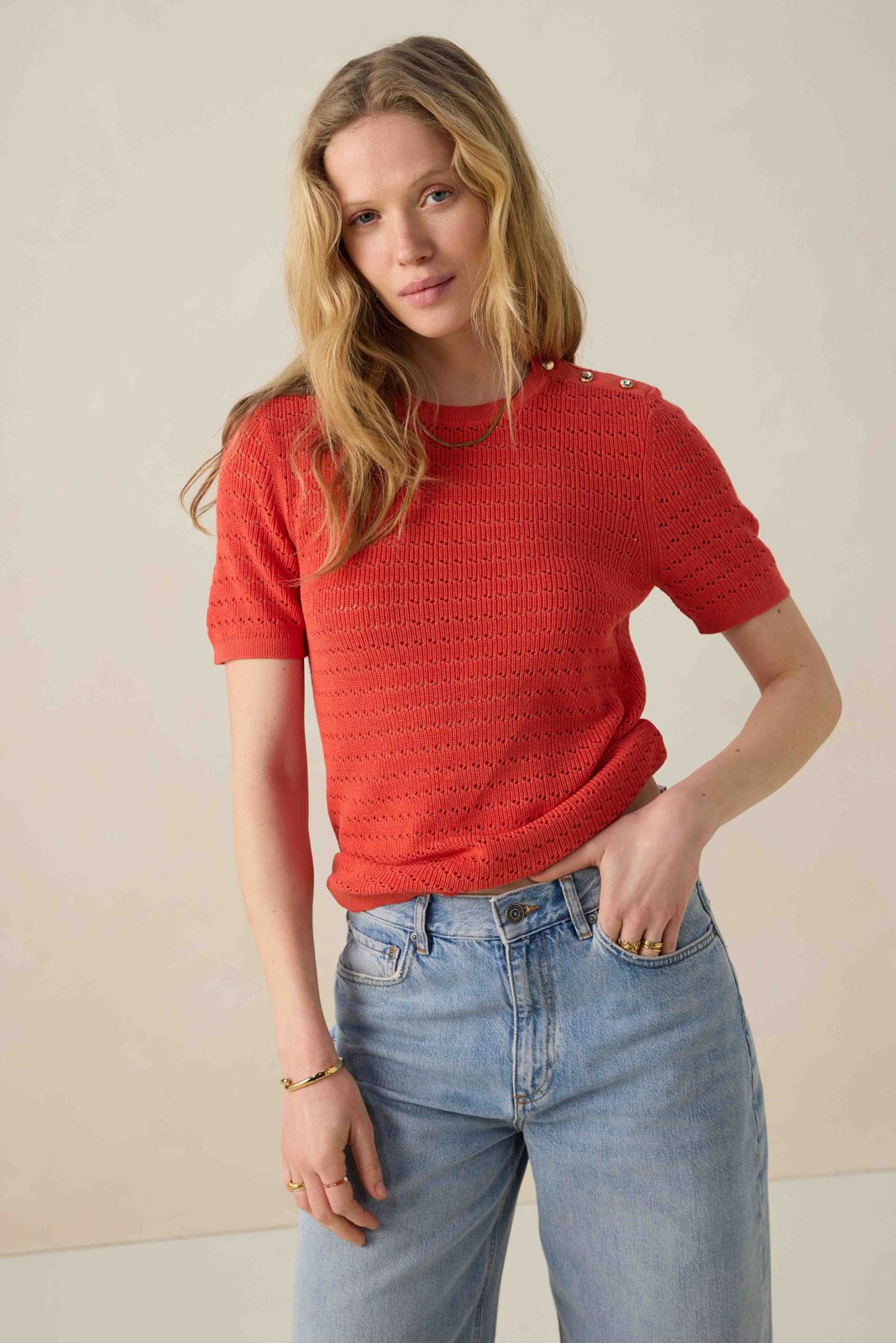 Rode gebreide trui met knopen