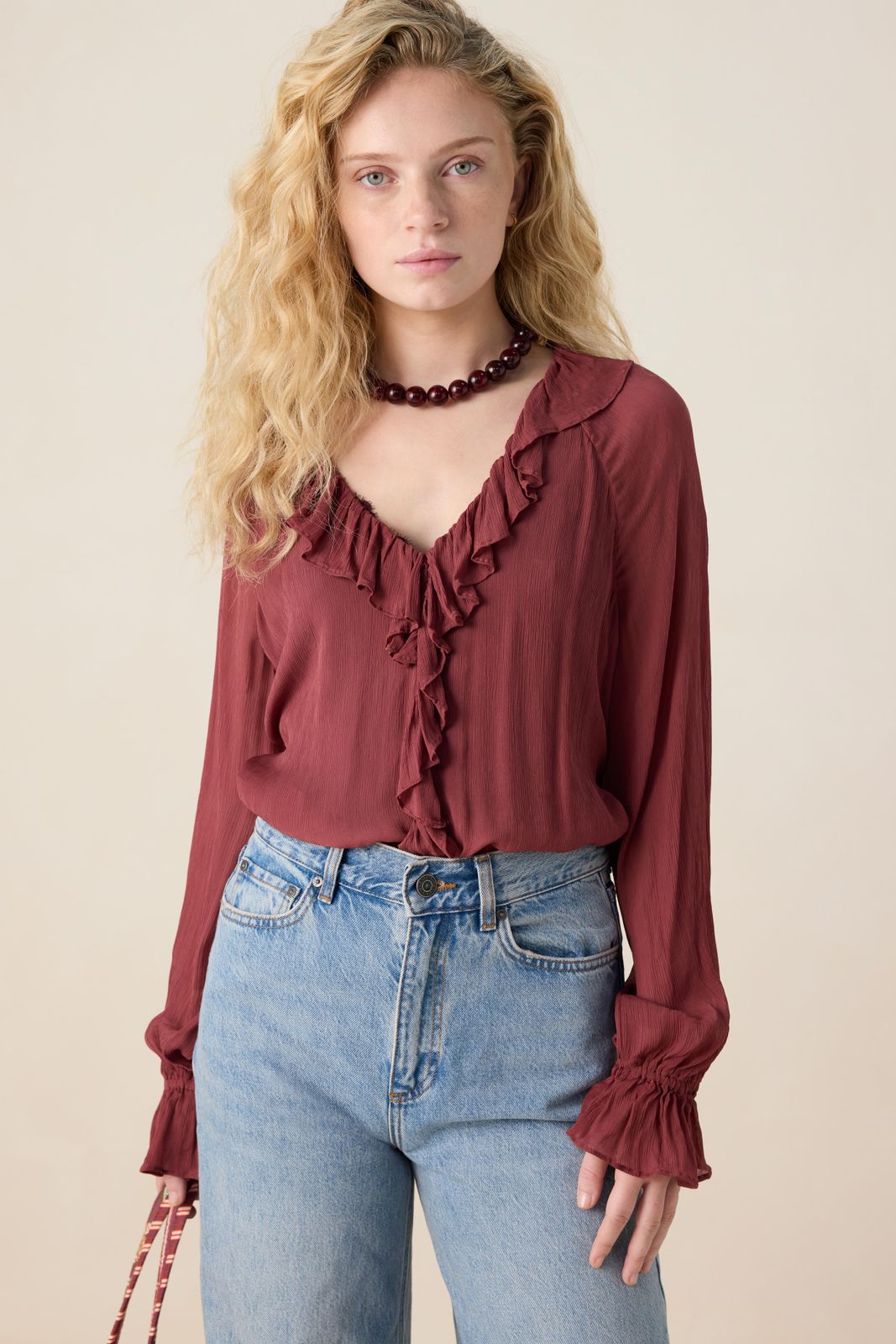 Donkerrode blouse met ruffle details
